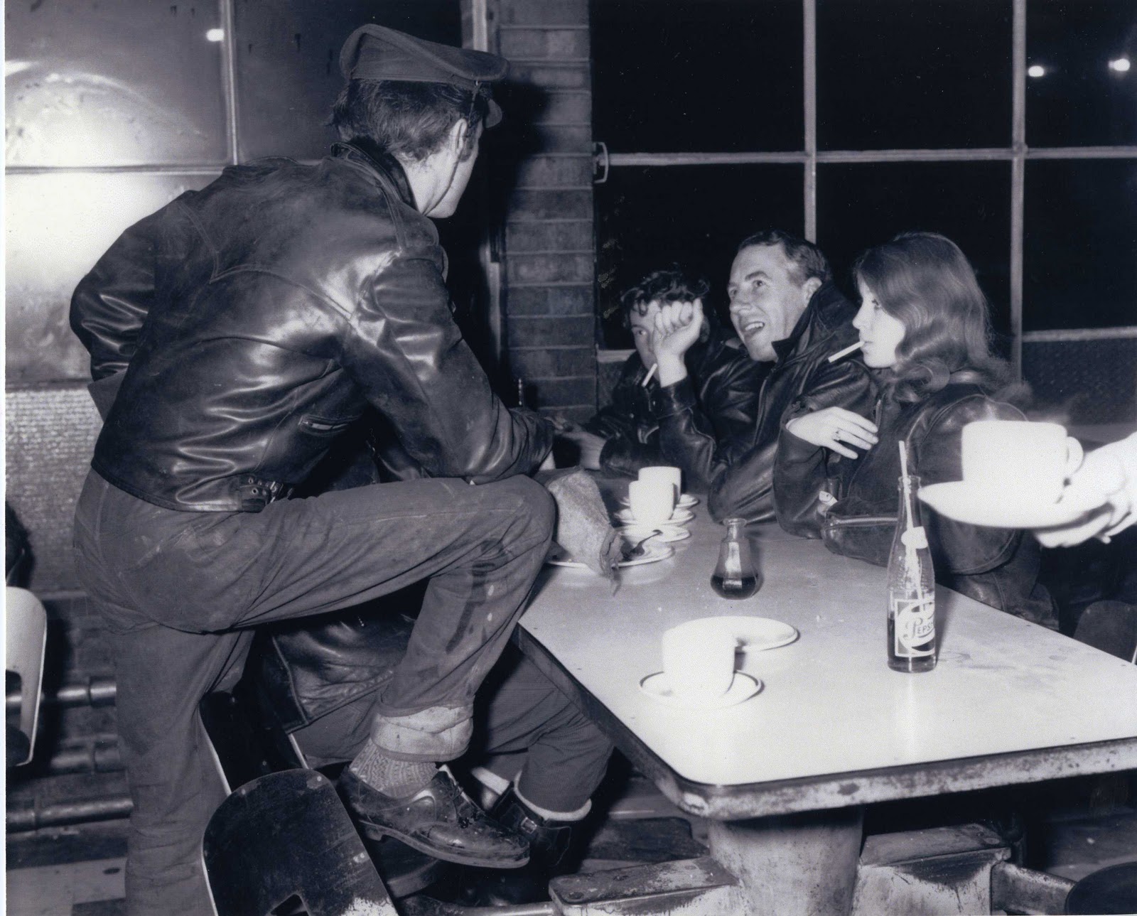 Con el fin de dar a conocer nuestra noche de apertura lo más amplia posible, preparado unos folletos que me tomó alrededor de lugares como el Busy Bee, la salida Dug-, Woodlands, Johnsons y, por supuesto, el as. Nunca fue fácil visitar un café por primera vez, pero en el caso de la Busy Bee tuve suerte. Una compañía de televisión alemana estaba haciendo un documental sobre la juventud británica y me pidió que les puso en contacto con algunos motociclistas jóvenes. Fuera me apresuré a la abeja para encontrar los motociclistas a participar en el rodaje.